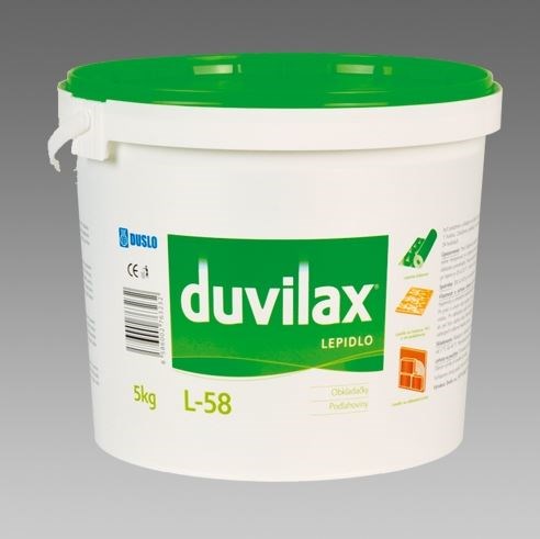 Univerzální stavební lepidlo. Duvilax L - 58 se používá neředěné na lepení textilních a PVC podlahovin, linolea, marmolea, koberců, plastových parapetů, vinylazbestové a mramorové dlažby, keramických a polystyrénových obkladů. Uvedené materiály se mohou lepit na podklady z cementového potěru, na omítky, dřevovláknité a dřevotřískové desky, na anhydritové a sádrové vyrovnávací vrstvy apod. Keramické materiály se lepí i na podklady nepřejímající vlhkost z lepidla. Obecně lze navzájem slepit všechny materiály, přičemž aspoň jeden z nich musí být savý, tj. absorbovat vlhkost z lepidla. Duvilax L - 58 se nanáší rovnoměrně na očištěný a odmaštěný povrch zubovou stěrkou. Aplikační teplota nesmí klesnout pod + 15°C. V případě potřeby vyšší hustoty, lze Duvilax L - 58 upravit vmícháním cementu. Pokud je potřeba zvýšit tloušťku lepeného spoje, je možné přidat do lepidla jemně přesitý písek, případně cement s pískem. Pro lepení obkladových prvků je lepidlo ve shodě s EN 12004:2001 – Malty a lepidla pro keramické obkladové prvky.