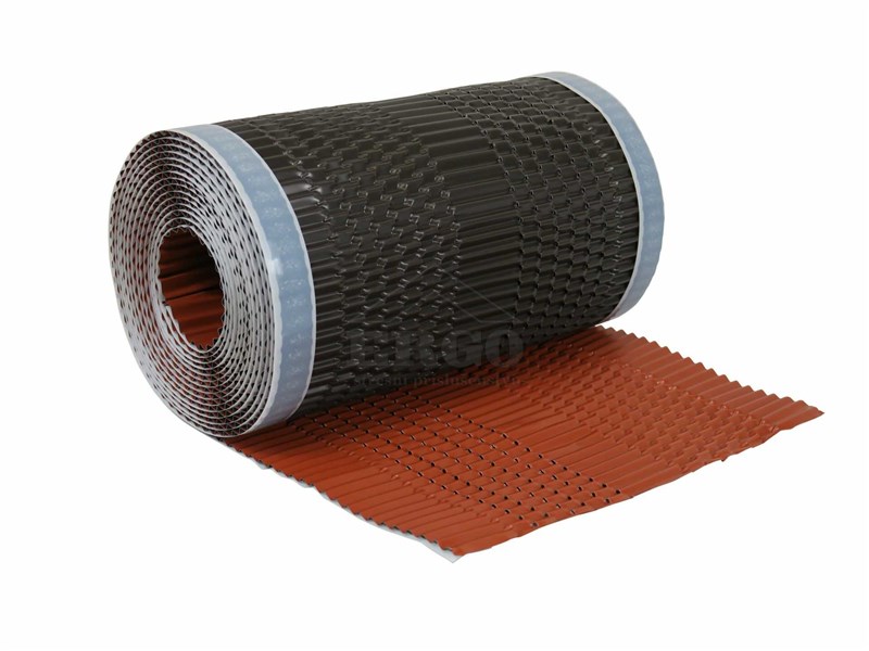 ERGO-hřebenový a nárožní pás celohliníkový je ideální pro suché pokládání hřebene a nároží. Je vyroben z jednoho kusu profilovaného lakovaného hliníku (nejsou žádné spoje, švy, lepení apod.), perforace zajišťuje odvětrávání. 20 mm široké butylové lepicí pásky po okrajích opatřené krycí fólií zabezpečují dokonalé přilnutí ke střešní krytině. Zajišťuje optimální cirkulaci vzduchu a tím umožňuje odvětrání podstřešního prostoru, zabraňuje vnikání sněhu a vody. Šíře role je 240 mm (určeno pro Bobrovku), 300 mm Standart, délka role je 5 m. Baleno po 5 kusech.