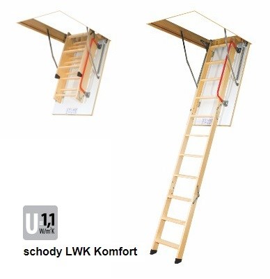 Půdní schody LWK Komfort jsou skládací schody vysoké kvality, 3 anebo 4 dílné. Mají esteticky vykonaný termoizolační poklop v bílém provedení, jak rovněž jsou standardně vybavené příslušenstvím umožňujícím komfortní používání ze schodů - patky, madlo. Stupně jsou vysunuté mimo schodnice žebříku, což dodatečně usnadňuje pohyb po nich. Poklop je zajištěn speciálním zámkem. Příslušenstvím je kovová tyč sloužící pro snadnou manipulaci s poklopem a ovládání zámku Na stupních jsou vyfrézované drážky proti uklouznutí. Mezi prostor je vyplněn 30mm vrstvou polystyrenu.