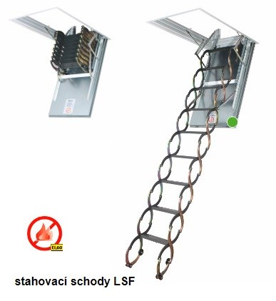 Protipožární kovové schody LSF slouží k výstupu do půdních prostor a také představují omezenou ohňovou bariéru při vzniku požáru uvnitř budovy. Představují zabezpečení před šířením ohně a kouře do prostoru nad schody a umožňují získat dostatek nezbytného času pro příjezd požární techniky. Vysoké parametry protipožární odolnosti umožňují jejich použití v místech, kde existuje možnost odříznutí cesty před ohěm.Stahovací systém schodů umožňuje jeho složení do malých rozměrů, díky čemu vzniká možnost montáže schodů do konstrukce s malými rozměry otvorů. Speciální regulační prvky poklopu schodů umožňují přizpůsobit schodiště výšce místnosti, bez potřeby dalších úprav.