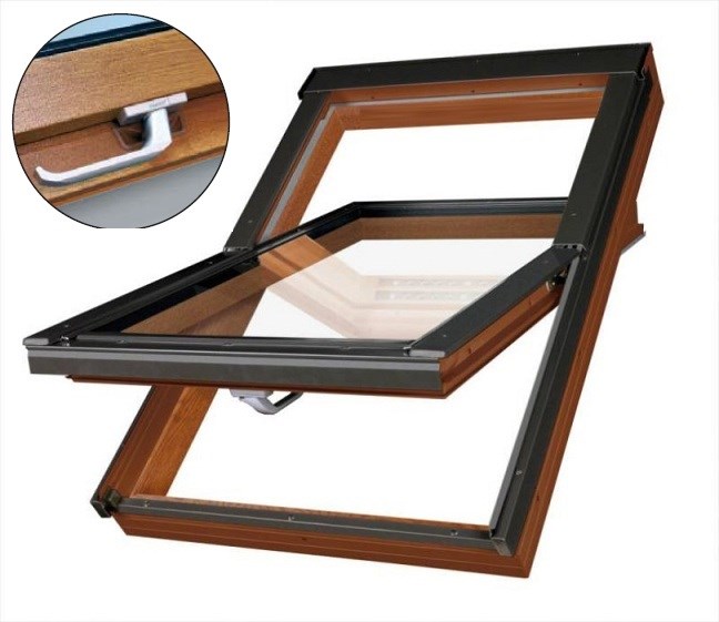 Plastová střešní okna kyvné konstrukce, vyrobena z vícekomorových profillů PVC hnědé barvy s vloženými výztuhami z pozinkované oceli. Tato konstrukce zajišťuje stabilitu celého okna a zamezuje jeho deformacím v průběhu užívání. Okno je ideálně přízpůsobeno pro použití do podkrovních prostor se zvyšeným výskytem vodních par avlhkosti (koupelny, kuchyně). Okno je trvanlivé, odolné vůčí korozi a atmosférickým vlivům. Údržba okna je omezena na nezbytné minimum. Plast, ze kterého je okno vyrobeno neabsorbuje vlhkost a charakterizuje se vysokou odolností vůči kyselinám a rozpouštědlům.