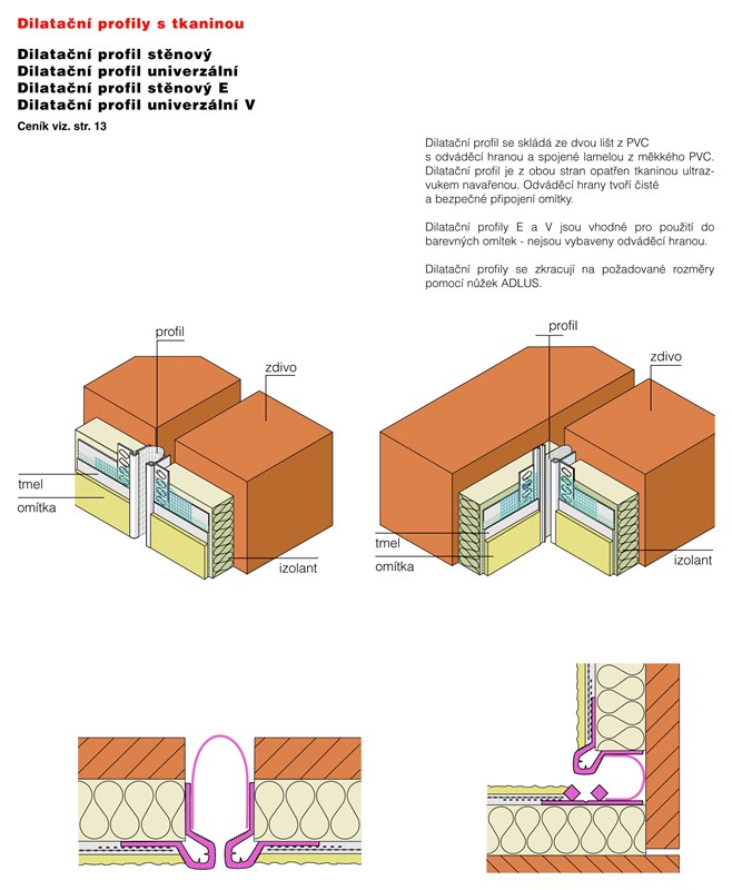 Slouží k trvanlivému zabezpečení vertikální dilatační spáry v zateplovacím systému proti zatečení. Vodicí hrana usnadňuje začištění a dotažení armovací vrstvy a omítky k profilu. Při montáži je nutné provést napojení lišt s přesahem středového pásu dle návodu. Profil se vyrábí ve variantě do stěny (E – VH), nebo do rohu (V – VH), je možné jej po montáži doplnit stěnovým, respektive rohovým krycím profilem. Materiál: PVC, měkčené PVC, ultrazvukem navařená tkanina se skelným vláknem (perlinka) 100 x 100 mm s alkalicky odolnou úpravou. Balení: 25 ks/karton, délka 2 m.