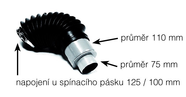 Napojení u spínacího pásku 125/100 mm, průměr 75 nebo 110 mm, těsnící manžeta pro DN 100 a 125.