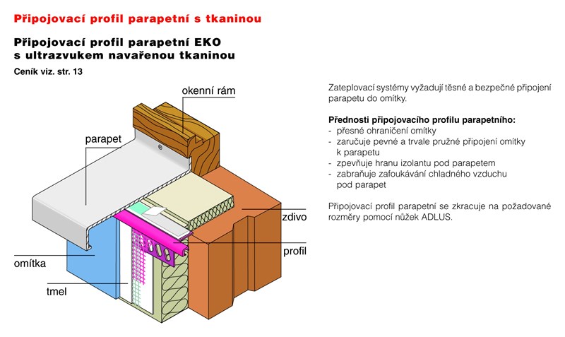 Profil se osazuje do tmelu na hranu desky izolantu, kterou chrání před mechanickým poškozením, je vybaven UV stabilní samolepicí polyethylenovou páskou pro trvalé utěsnění. Lišta nemá stavitelný úhel sklonu. Materiál: UV stabilní PVC, tkanina se skelným vláknem (perlinka) s alkalicky odolnou úpravou 100 mm. Balení: 40 ks/karton, délka 2 m.