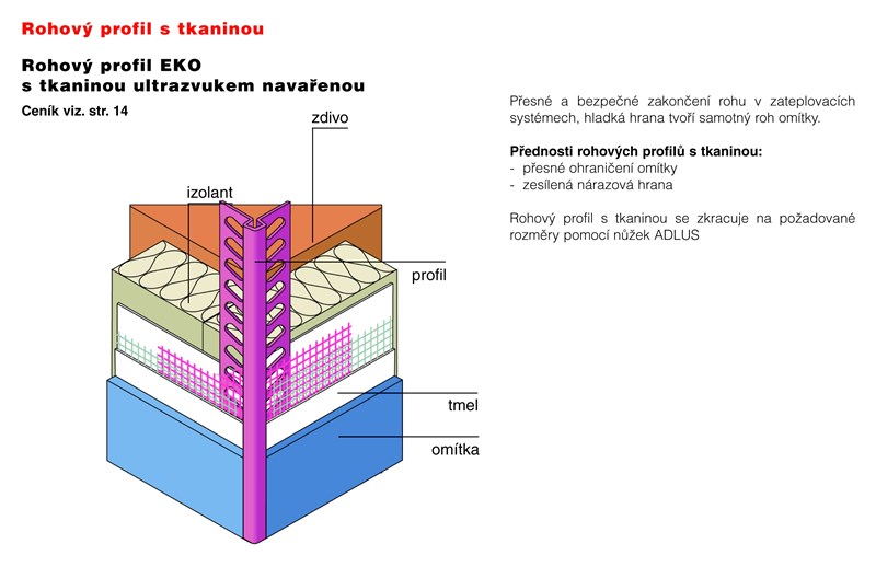 Nárazová hrana zvyšuje mechanickou odolnost profilu, proto se používá na nejvíce exponovaných místech s vyšším rizikem poškození rohu jako jsou například vchodové nebo balkonové dveře. Lišta se vkládá do tmelu, přesah tkaniny pro napojení vždy minimálně 100 mm. Materiál: PVC, ultrazvukem navařená tkanina se skelným vláknem (perlinka) 100 x 100 (150,230) mm s alkalicky odolnou úpravou. Balení: 25 ks/karton, délka 2 m.