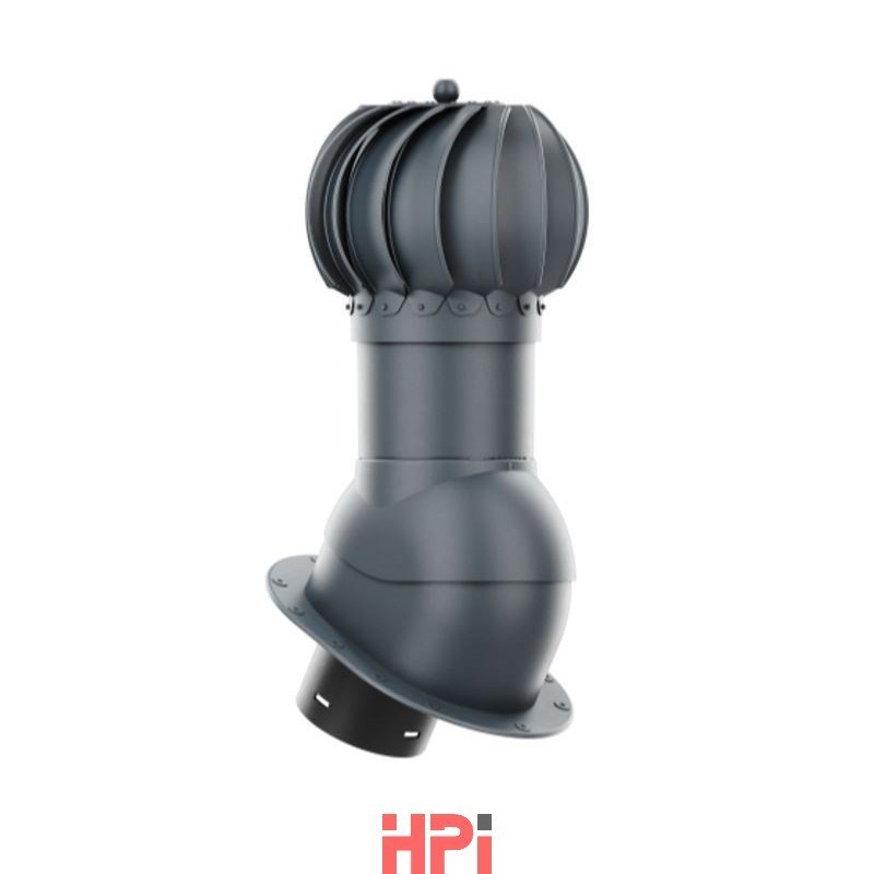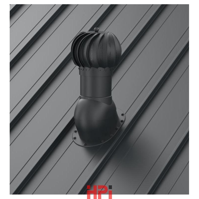 Rotační odvětrávací set je určen pro rovné plechové krytiny. Slouží k odvětrání střešního pláště, půdních prostor, digestoří, sklepů, WC, koupelen apod. Rotační hlavice o průměru 150 mm zvyšuje větrací kapacitu vytvářením stálého podtlaku v potrubí. Set je vyroben z UV stabilizovaného polypropylenu (PP). Pro zajištění chodu i v těch nejtěžších podmínkách je hlavice opatřena otočným ocelovým mechanismem uloženým do dvojitých kuličkových ložisek v olejové lázni. Integrované butylové těsnění zajišťuje vodotěsnost mezi krytinou a větrací taškou. Vruty pro montáž jsou součástí balení. Určeno pro šikmé střechy se sklonem od 5° do 45°.