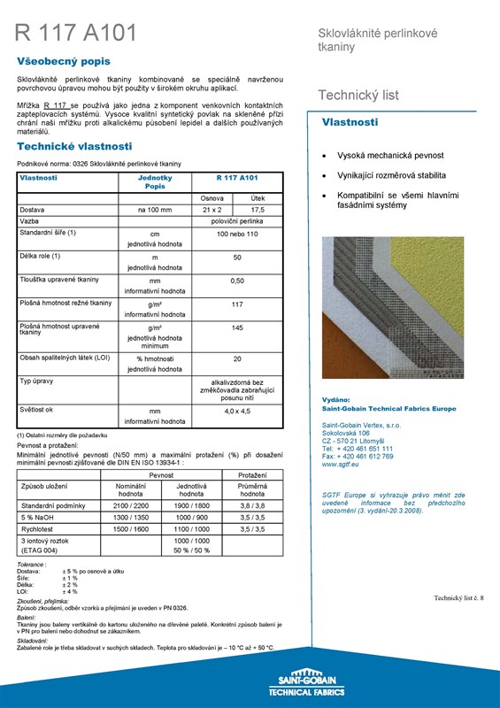 Minimální šířka napojení tkaniny 10 cm, umístění v armované vrstvě ve 2/3 tloušťky, velikost oka 4/4,5 mm, plošná hmotnost upravené tkaniny 145 g/m2. Materiál: E sklo, alkalicky odolá povrchová úprava. Balení: 10, 20, 50 bm/role, šířka role 1,1 m.