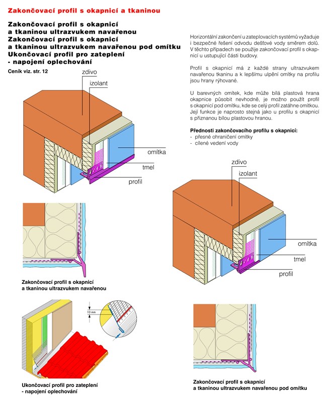 Zakončovací profil nadokenní s okapničkou (pod omítku) plní funkci horizontálního ukončení omítky nad okny a dveřmi. Odvádí dešťovou vodu z povrchu fasády mimo okenní otvor a zamezuje vzlínání vody do nadpraží, zároveň zpevňuje hranu nadpraží jako ochrana před mechanickým poškozením. Profil je díky své konstrukci po natažení finální omítky z pohledové strany neviditelný. Zakončovací profil nadokenní s okapničkou-pod omítku je také součásti řešení „Zakládací sada ETICS“ nahrazující dnes už nevyhovující hliníkovou zakládací lištu (tepelný most, nízká odolnost, nevyhovuje požární normě) společně s PVC zakládacím úhelníkovým profilem (č.v.8800-20) vyhověl zkoušce požární odolnosti dle normy ČSN ISO 13785-1 pro montáž kontaktního zateplovacího systému s izolantem z EPS. Sadu lze použít na různé tloušťky a typy tepelných izolací v rozmezí 80-300 mm (resp. 350 mm dle varianty použité lišty s okapničkou), maximální síla izolantu pro protipožární řešení je 200 mm. Zakládací sadu lze využít v kontaktních zateplovacích systémech všech výrobců. Materiál: UV stabilní PVC, tkanina se skelným vláknem (perlinka) s alkalicky odolnou úpravou 100/100 (150) mm. Balení: 25 ks (100/150 - 20 ks) /karton, délka 2,0 m. Výrobek „Zakládací sada“ splňuje požadavky normy ČSN 73 0810:2016 - Požární bezpečnost staveb.