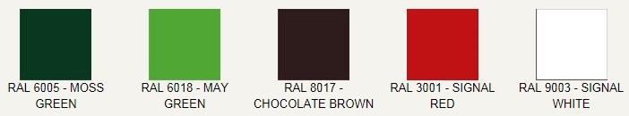 Barva: Níže vám nabízíme šest základních barev ze vzorníku RAL. Pokud požadujete jakýkoli jiný odstín dle RAL vzorníku, bude cena navýšena o 3% z ceny vámi zvoleného skleníku. Číslo barvy v každém případě uveďte do poznámky při objednání skleníku.