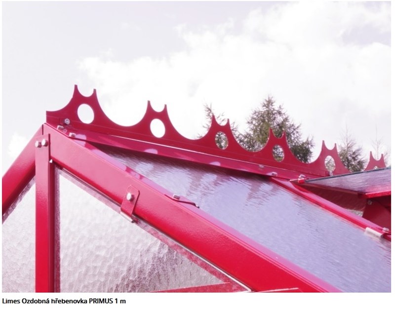Ozdobná hřebenovka je přímo přimontovaná k dodanému hřebenovému plechu. Cena je udaná za 1 m, je tedy třeba do množství napsat délku objednaného skleníku. Hřebenovka má stejnou barvu jako celý objednaný skleník. Uvedená cena platí pro základní barvy, viz foto. Číslo Vámi zvolené barvy prosím uveďte v objednávce. Pokud máte zájem o jinou barvu (ze vzorníku RAL), prosím kontaktujte nás. Příp. uveďte do doplňujícíh informací v objednávce.