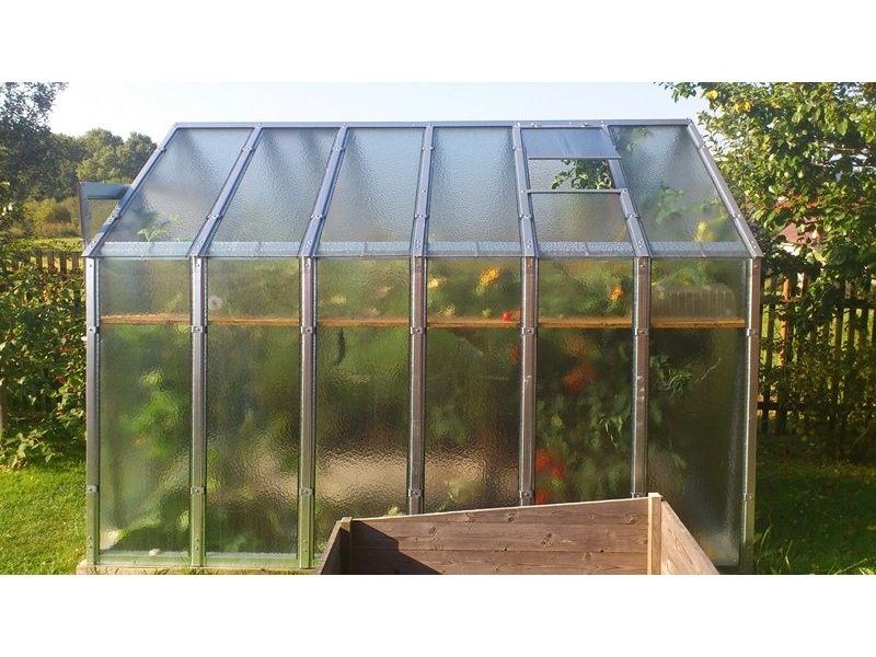 Popis: Boční stěny skleníku jsou mírně šikmé. Odolná konstrukce vhodná do míst s nepříznívými podmínkami.