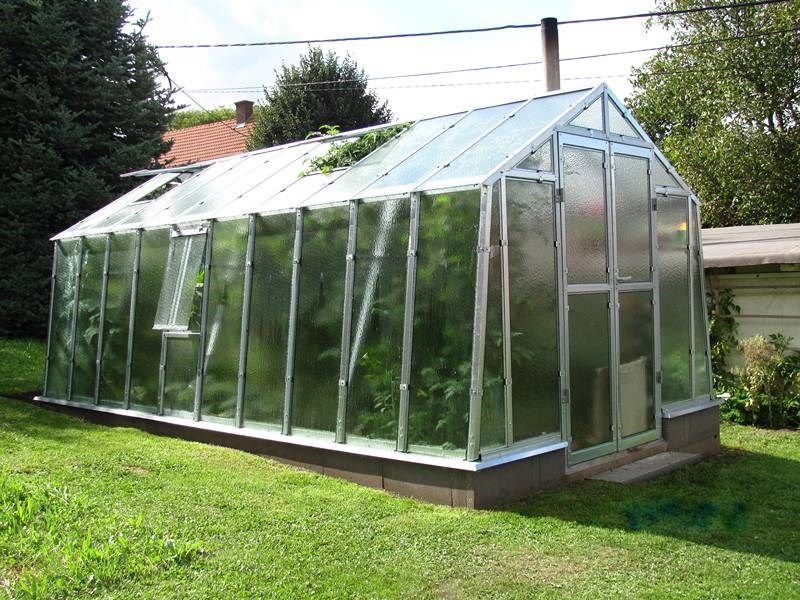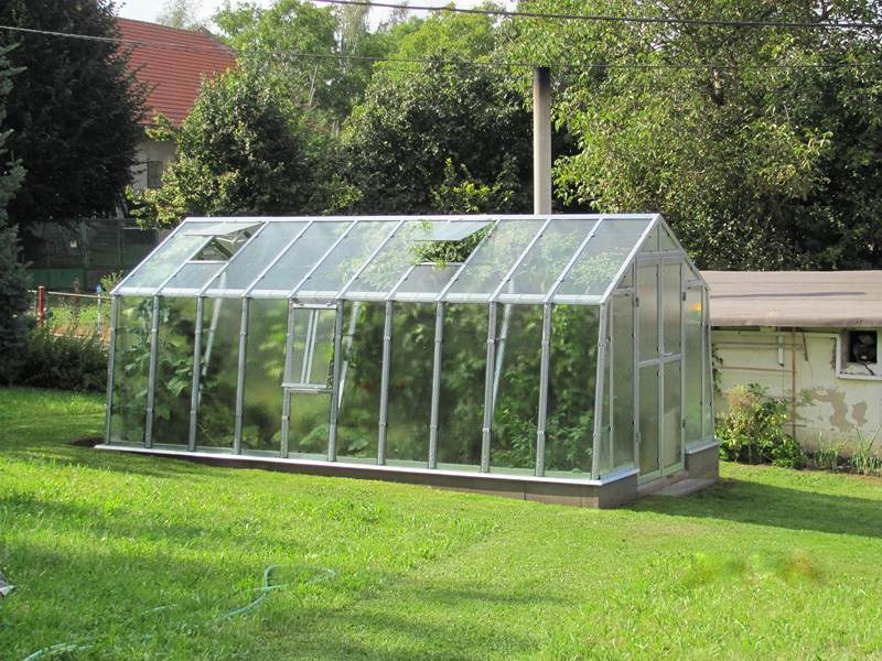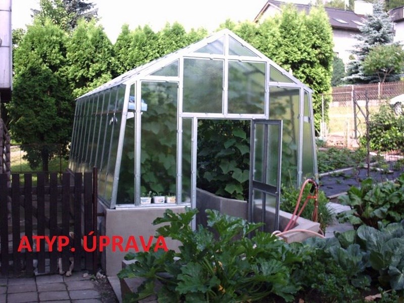 Popis: Boční stěny skleníku jsou mírně šikmé. Odolná konstrukce vhodná do míst s nepříznívými podmínkami.