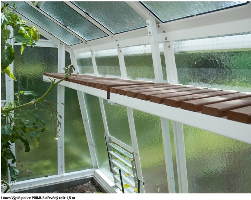 Rozměr: šíře je 30 cm. Police je umístěna ve výšce cca 115 cm. Popis: Boční police má rám z lakovaného profilu, jako výplň je použit dřevěný rošt s nátěrem. Dřevěný rošt je dostatečně masivní, aby unesl předpokládanou zátěž. Výška roštu je cca 5 cm. Je mnohem odolnější případným nárazům než bezpečnostní sklo. Dovolená zátěž na polici je 20 kg/1 modul. Police se dodávají po celé délce skleníku v modulech po 1,5 m. Nelze tedy objednat pouze jeden modul, ale vždy je nutné uvést počet modulů. Telefonicky budete kontaktováni pro přesné umístění ve skleníku. Rám police má stejnou barvu jako objednaný skleník. Uvedená cena platí pro základní barvy, viz foto. Číslo Vámi zvolené barvy prosím uveďte v objednávce. Pokud máte zájem o jinou barvu (ze vzorníku RAL), prosím kontaktujte nás. Příp. uveďte do doplňujícíh informací v objednávce.