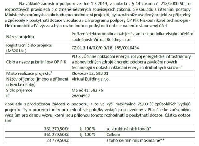 Název projektu: Pořízení elektromobilu a nabíjecí stanice k podnikatelským účelům společnosti Virtual Building s.r.o.