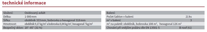 • šindele nové generace nabízí nejen vysokou odolnost, flexibilitu použití, snadnou pokládku a nízkou plošnou hmotnost (cca 9 kg/m2), ale zejména řadu různých barevných odstínů, které jsou ideálním řešením pro originální střechy s vysokou estetickou hodnotou.