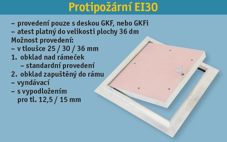 výplní Revizní dvířka čtvercového nebo obdélníkového tvaru jsou určena do sádrokartonových systémů. Skládají se z pevného hliníkového rámu a výklopné hliníkové klapky, osazené sádrokartonovou GKF výplní (případně se dají použít pro příčku i podhled z 12,5 nebo 15 mm sádrokartonu vložením vyrovnávacích pásku). Mezera mezi pohyblivým dílem klapky a pevným rámem je vyplněna vypěňujícím protipožárním těsněním. Dvířka se otevírají kličkou, která je součástí dodávky. - Když dvířka v síle 15 a 25 mm zabudujeme do SDK stěny, standardně budou splňovat uvedenou nižší protipožární odolnost. Pokud ale z vnitřní strany obložíme dvířka minerální vlnou tloušťky 25 mm v objemové hmotnosti 150kg/m3, budou splňovat uvedenou vyšší protipožární odolnost.