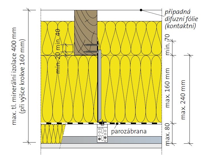 Další výhodou zateplení podkroví s použitím krokvového nástavce je možnost lepšího dotěsnění napojení parozábrany na návazné a prostupující konstrukce a prvky střechy. Neméně důležitým kladem tohoto řešení je i snadná aplikace parozábrany, a to díky terčům oboustranně lepicí pasky, umístěným na spodním líci krokvového nástavce.