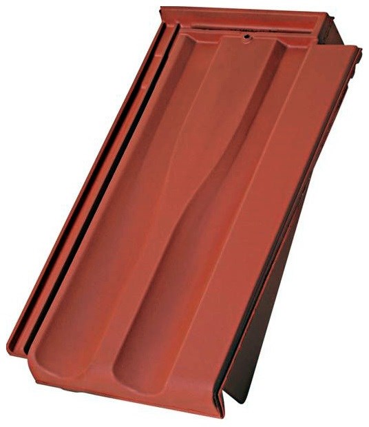 Taška okrajová pravá – konstrukčně nejlepší řešení bočního ukončení střechy představují okrajové tašky. Tvoří ideální ochranu štítu do stran tvarovanou bočnicí. Výška štítové bočnice je v rozmezí 50–80 mm. Při krycí délce v rozmezí 340–390 mm je nutné upravit tašku řezem v pravé horní části.