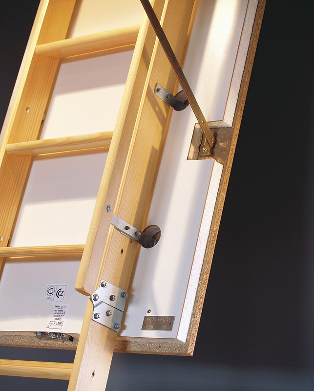 schody 15 min. dodávané včetně smrkových lemovacích lišt, včetně dřevěné stahovací tyče, ke které je připevněn návod na montáž