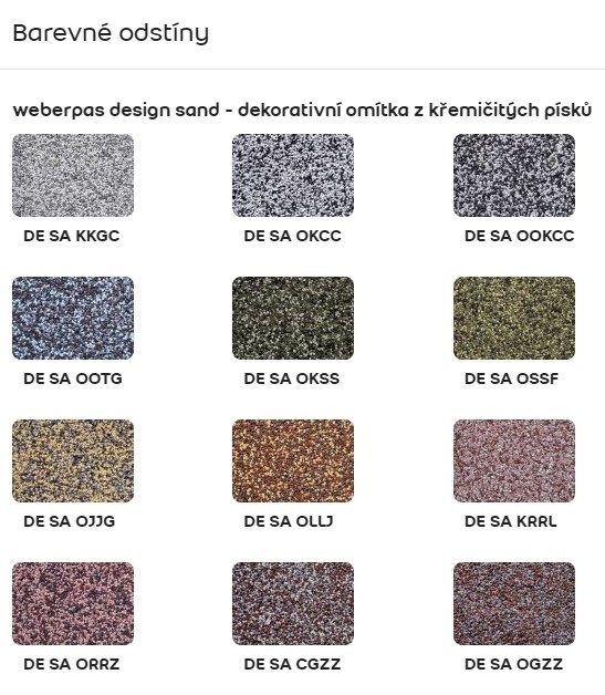 Berevné vzory podle vzorkovnice weberpas design sand. Při použití na tepelně izolační materiály, zvláště na osluněné plochy, se doporučuje používat pouze světlejší odstíny s koeficientem HBW minimálně 25.