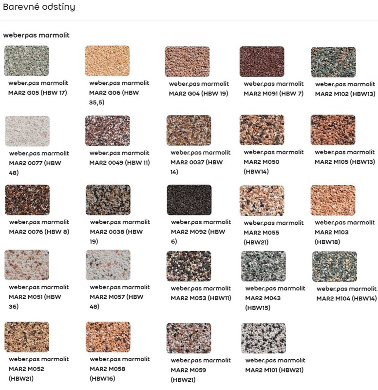 Dekorativní omítka připravená pro okamžité zpracování s pojivem na bázi akrylátových pryskyřic.Nanáší se na zaschlý weber.pas podklad UNI - v bílém odstínu.Weber. pas marmolit se dělí podle hrubosti zrna na: jemnozrnný MAR1 do 1,0 mm, střednězrnný MAR2 do 2,0 mm, hrubozrnný MAR3 2,0-4,0 mm.Spektrum barev podle vzorkovnice weber.pas marmolit