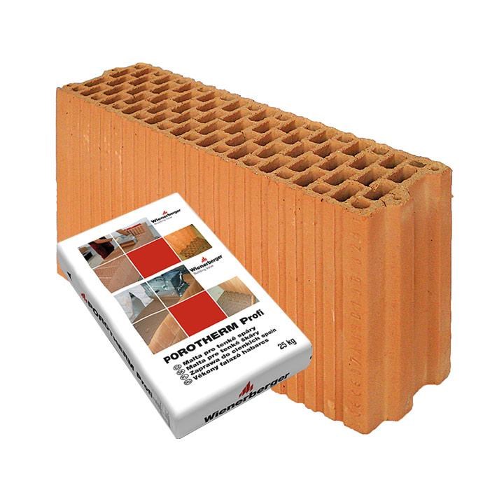 Součástí dodávky je odpovídající množství malty pro tenké spáry Porotherm Profi. Pro založení stěn se dodává požadované množství zakládací malty Porotherm Profi AM (Anlegemörtel).