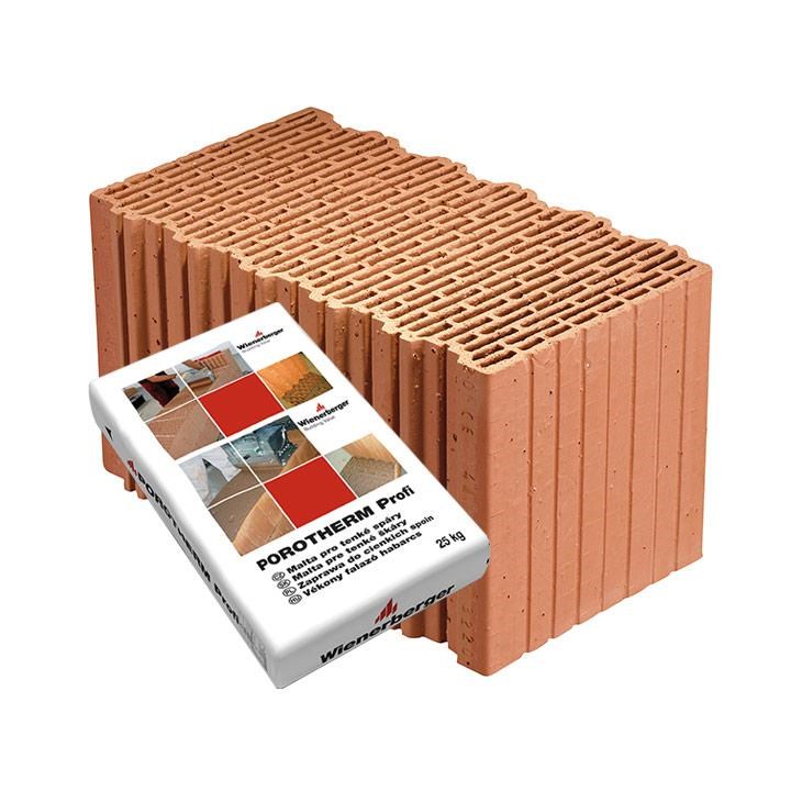 Součástí dodávky je odpovídající množství malty pro tenké spáry Porotherm Profi. Pro založení stěn se dodává požadované množství zakládací malty Porotherm Profi AM (Anlegemörtel).