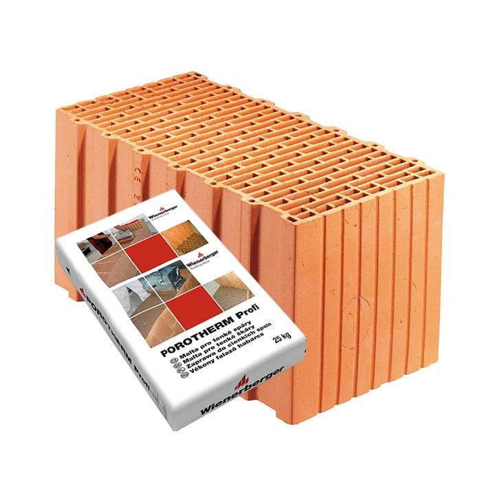 Součástí dodávky je odpovídající množství malty pro tenké spáry Porotherm Profi. Pro založení stěn se dodává požadované množství zakládací malty Porotherm Profi AM (Anlegemörtel).